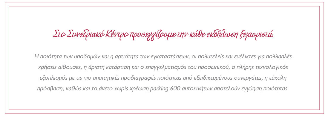 Οι ιδανικές συνθήκες ορατότητας και ακουστικής στις ατμοσφαιρικές και ευέλικτες αίθουσες, όπως επίσης και οι εξαιρετικές διακοσμητικές παρεμβάσεις από ειδικούς διακοσμητές, θα μεταμορφώσουν τους χώρους ανάλογα με το θέμα της εκδήλωσης.